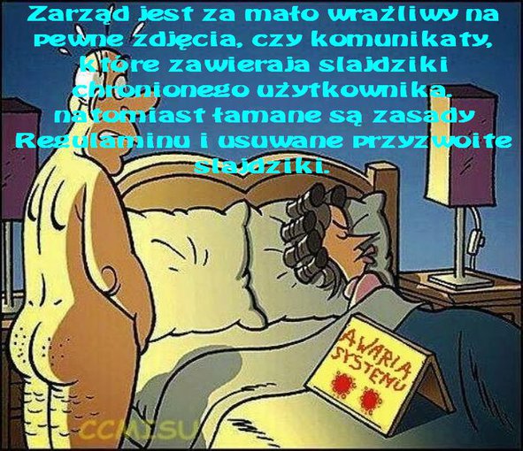 UŻYTKOWNICY SPOTYKAJĄ SIĘ Z ODWETEM TZW. "MŚCICIELA", KTÓRY JAK W PIJANYM WIDZIE WYWIJA SLALOMY Z JEDYNKAMI PO SLAJDZIKACH, A W NOCY OBRZUCA UŻYTKOWNIKÓW ORDYNARNYMI OBELGAMI I POGRÓŻKAMI. (TRZEŹWY OPAMIĘTAŁBY SIĘ I ZASTANOWIŁ NAD SŁOWNICTWEM ! ) KAŻDEMU WOLNO REGULAMINOWO, CZY TO TAK MA WYGLĄDAĆ ADMINISTRACJO?