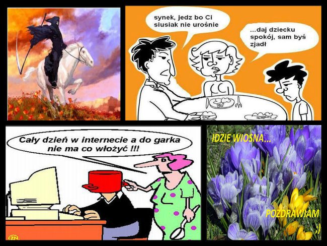 http://animatedgif.biz/mpeg-creation2/temp/kitn22qnf7urq185ke1rnooib0/indexweb.htm @ Nie dopuść, aby radość posmutniała, lecz by zawsze jaśniała pięknem Twoich oczu. Z dzisiejszymi pozdrowieniami przesyłam Tobie uśmiech radosny, bo dni są coraz dłuższe, a to znak że mamy WIOSNĘ! @ Popieram Elżuniu jak zawsze i mam w poważaniu mściciela znikąd. Jedynki to tylko bat z piasku, może sobie nim machać i potupywać ze złości. Świetny Eluniu slajdzik dla inteligentnych, z pazurem i z morałem. "Nie dla idiotów"! Nie każdemu furiatowi co z obłędem w oczach gania po "Slajdziku" jak wściekły. Nie ma zgody Administratorze i Właścicielu na tolerowanie bajzlu, na jaki przymykacie oczy. Pozdrawiam cieplutko Elżuniu, miłego dzionka i dużo słonka życzę w ten deszczowy poranek. A słynne gdyńskie lody "Mewa" w czekoladzie znam, fajny smak i to śmieszne powiedzenie. Całuski. Jadzia.