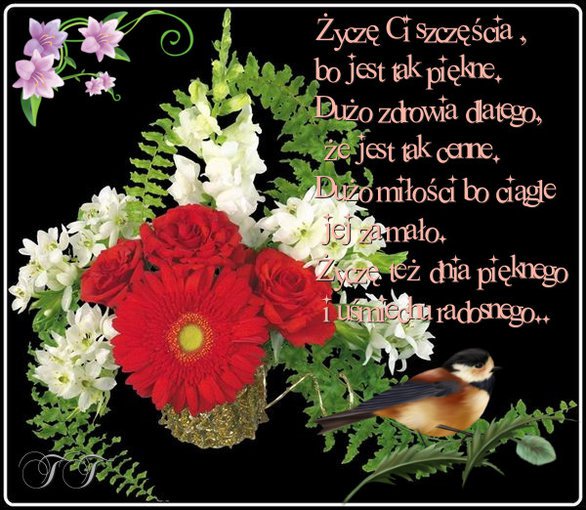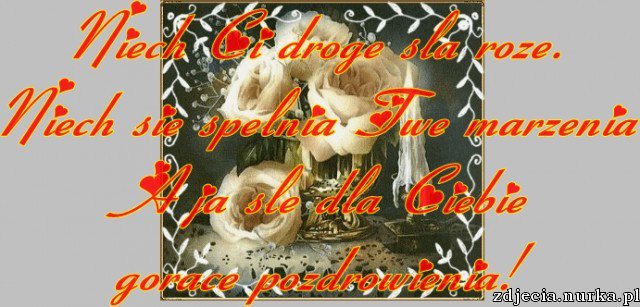 Złotym promieniem, lekko w błękicie słońce nam ciepłe życzenia pisze. Ja się dołączam i życzę, aby pomyślnym torem pobiegły sprawy, które czas właśnie na dziś wyznaczył. Do tego niechaj na dużej tacy przyniesie szczęście, pogodę duszy i niech koniecznie pięknem nas wzruszy… Cieplutko pozdrawiam i 55555555555555 zostawiam. Miłego dnia.